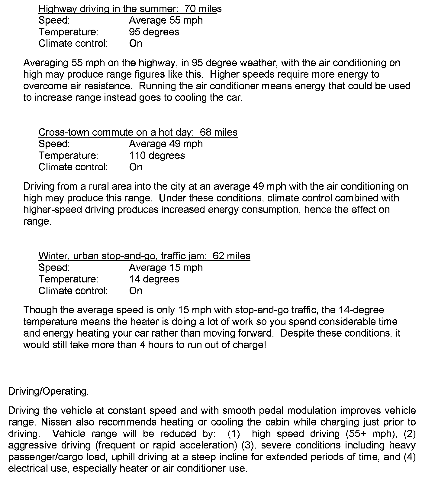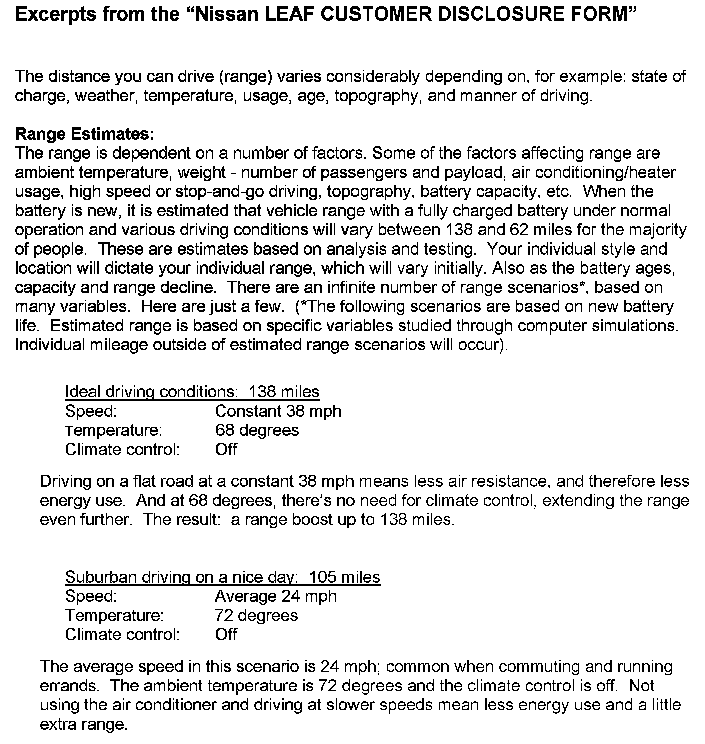 1. It is the Certified Nissan LEAF Dealer's responsibility to assure that customers understand normal electric vehicle operation at the time of delivery to avoid customer misunderstanding and to set appropriate range expectations. The dealers sales department is responsible for reviewing the "Nissan LEAF Customer Disclosure Form" with the customer which covers range. Information related to range from the disclosure form is included with this bulletin. This disclosure form is provided with the LEAF New Vehicle Delivery System folder in each vehicle.