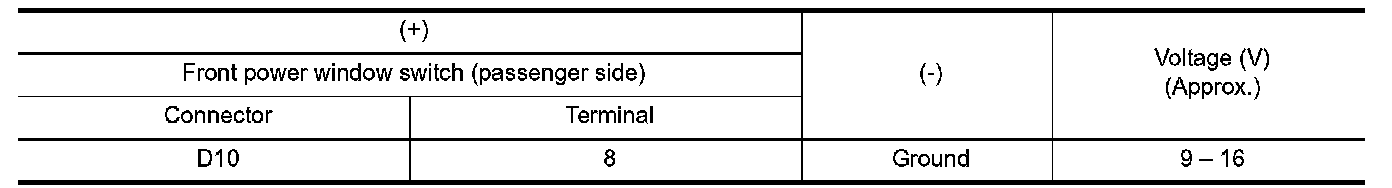 4.Check voltage between front power window switch (passenger side) harness connector and ground.