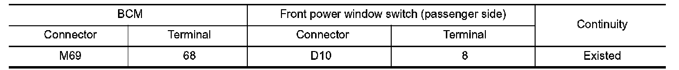 3.Check continuity between BCM harness connector and front power window switch (passenger side) harness connector.