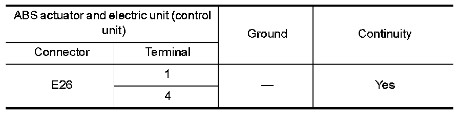 Check continuity between ABS actuator and electric unit (control unit) connector E26 terminals 1, 4 and ground.