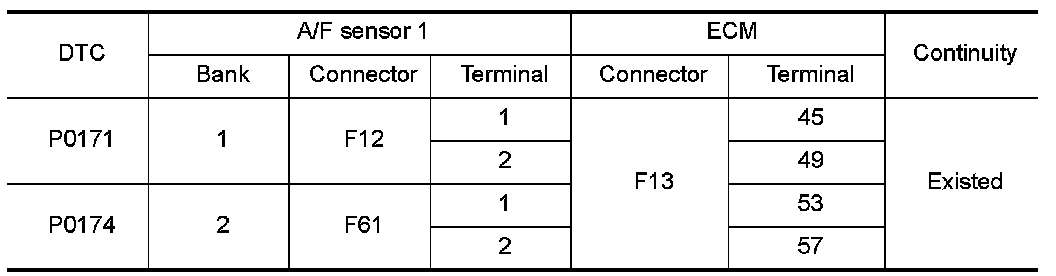 4.Check the continuity between A/F sensor 1 harness connector and ECM harness connector.