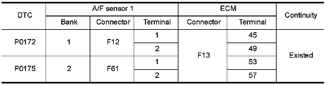 4.Check the continuity between A/F sensor 1 harness connector and ECM harness connector.