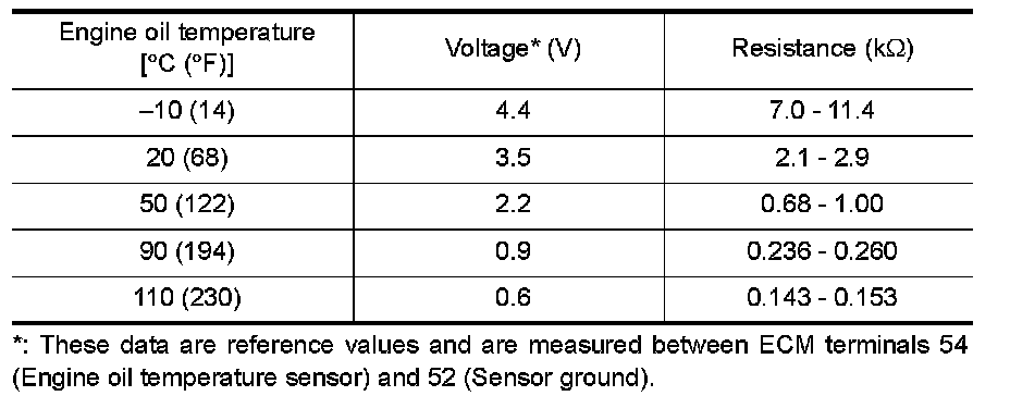 The engine oil temperature sensor is used to detect the engine oil temperature. The sensor modifies a voltage signal from the ECM.