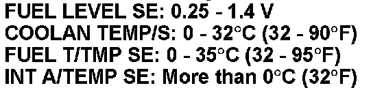 If NG, turn ignition switch OFF and leave the vehicle in a cool place (soak the vehicle), or refill/drain fuel until the output voltage of the "FUEL LEVEL SE" meets within the range above and leave the vehicle for more than 1 hour. Then start from step 1.