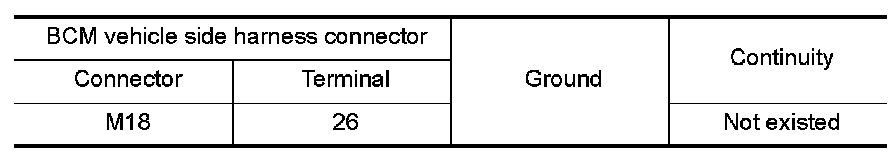 Check continuity between BCM vehicle side harness connector terminal and ground.