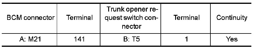 2.Check continuity between BCM connector and trunk opener request switch connector.