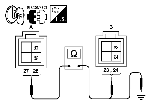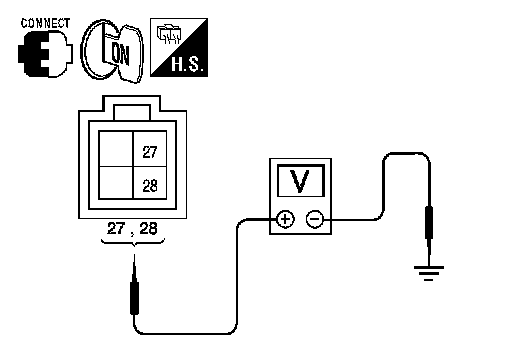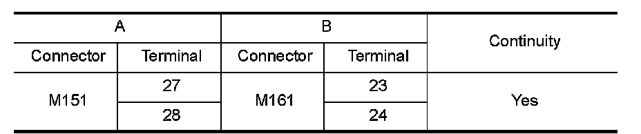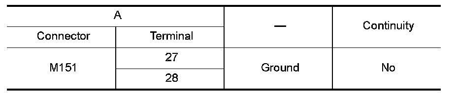 4.Check continuity between display unit harness connector M151 (A) terminals 27, 28 and ground.