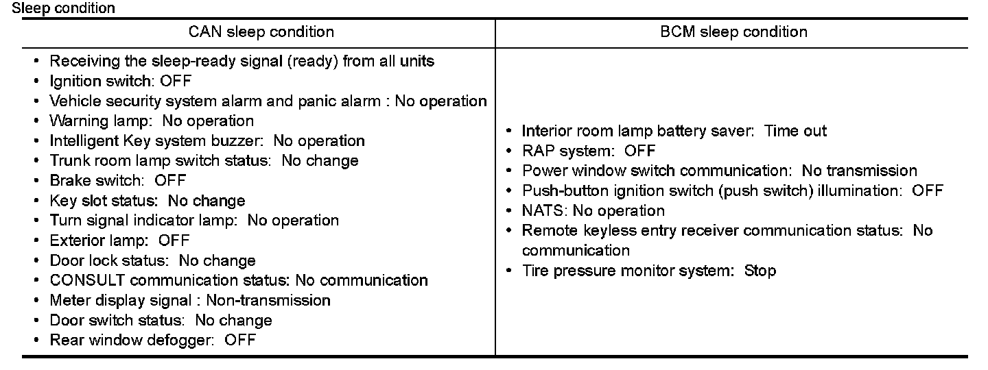 - BCM transmits the sleep wake up signal (sleep) to each unit when all of the CAN sleep conditions are fulfilled.
