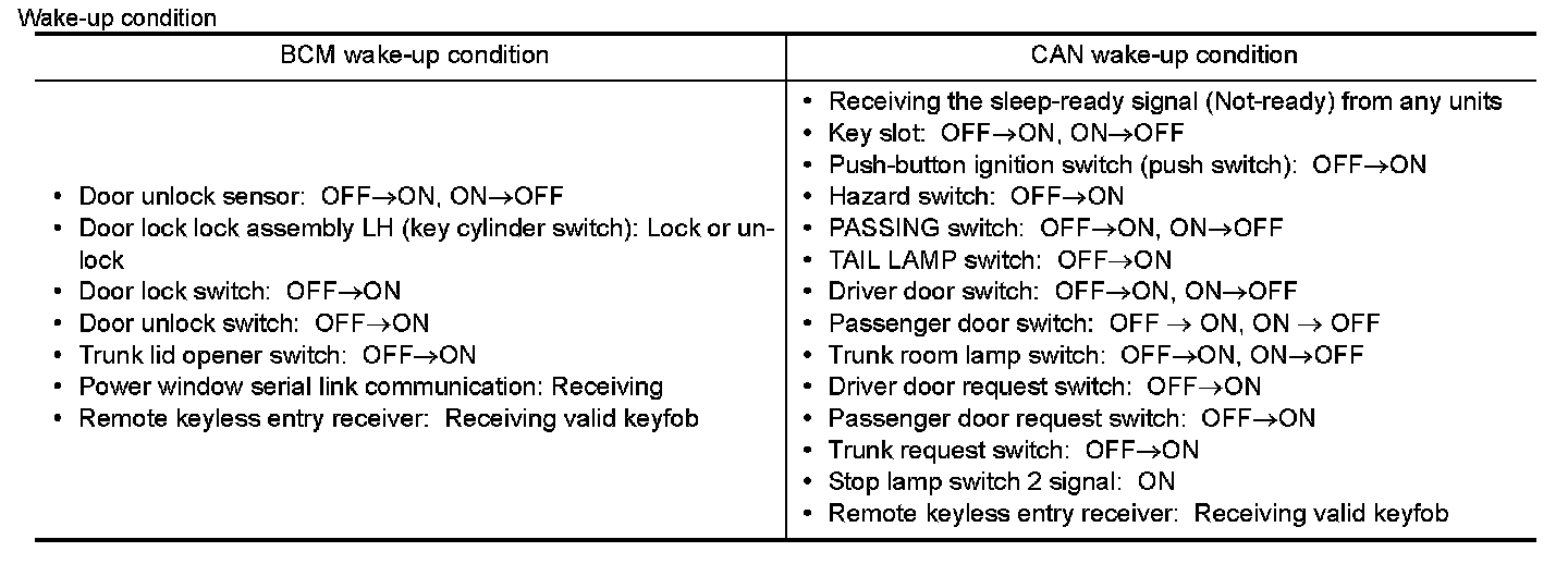 - BCM transmits the sleep wake up signal (wake up) to each unit when any of the CAN wake-up conditions is fulfilled. It changes from the low power consumption mode or the CAN communication sleep mode to the normal mode.