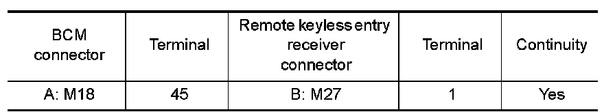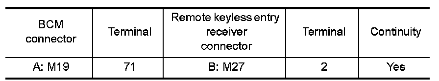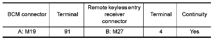 1.Check continuity between BCM connector and remote keyless entry receiver connector.