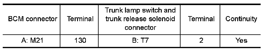 2.Check continuity between BCM connector and trunk lamp switch and trunk release solenoid connector.
