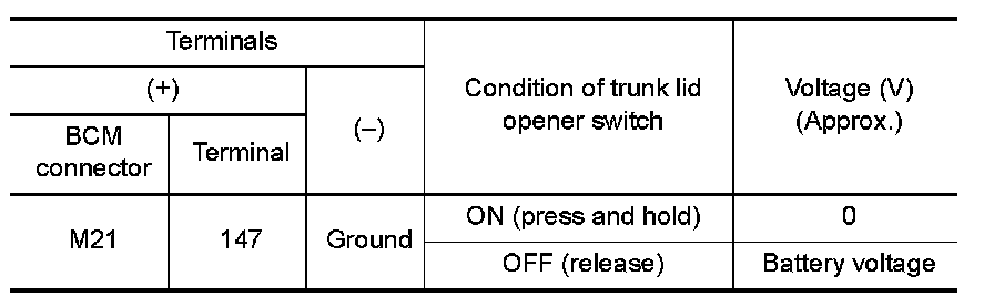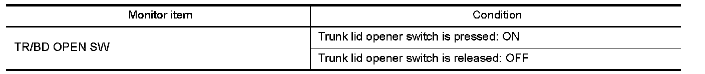 Check trunk lid opener switch TR/BD OPEN SW in Data Monitor mode with CONSULT.
