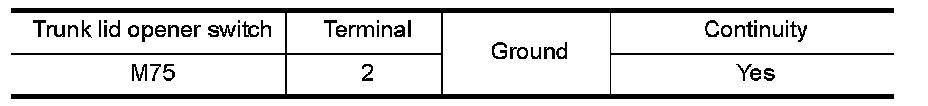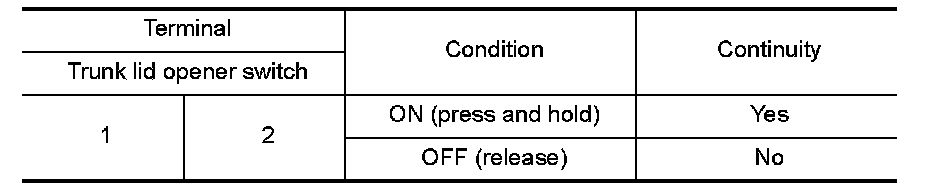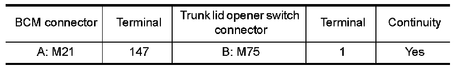 2.Check continuity between BCM connector and trunk lid opener switch connector.