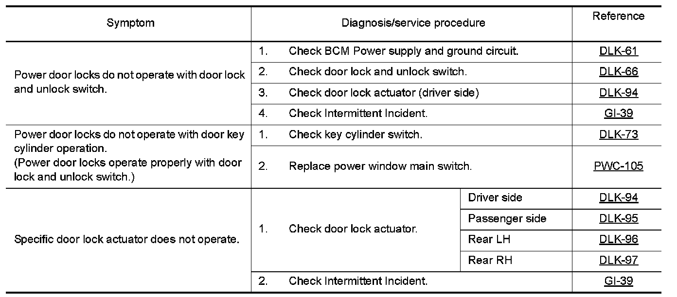 DOOR LOCK AND UNLOCK SWITCH : Symptom Table