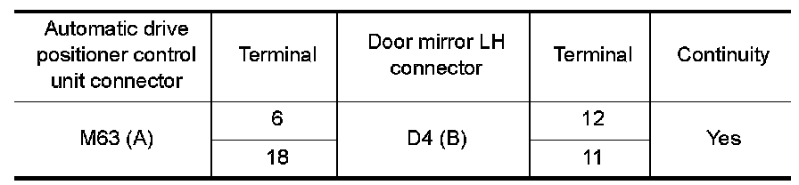 1.Check continuity between automatic drive positioner control unit harness connector and door mirror LH harness connector.