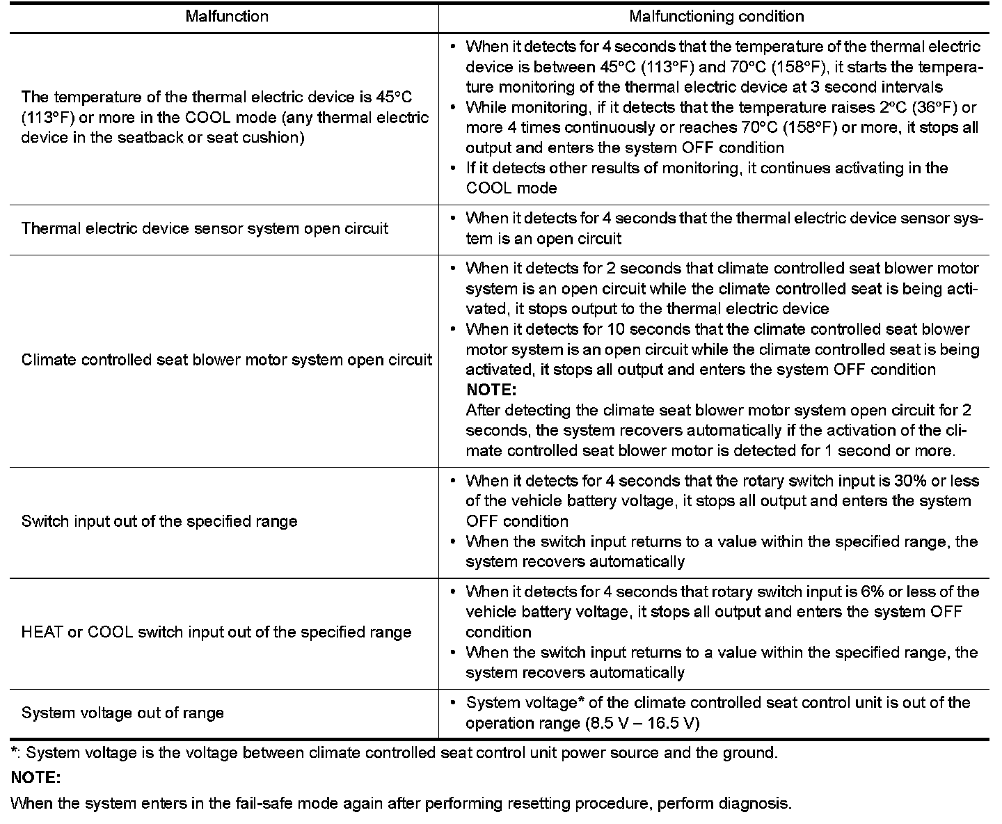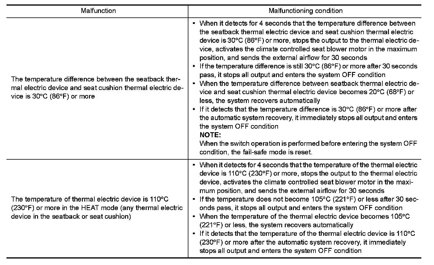- When a malfunction occurs in the systems shown as per the following, climate controlled seat control unit stops output.
