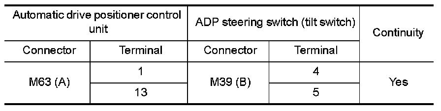 2.Check continuity between automatic drive positioner control unit harness connector and ADP steering switch harness connector.
