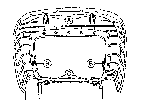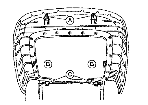 b.Carefully pull upward on the lower seatback board to release the two bottom retainers (C).