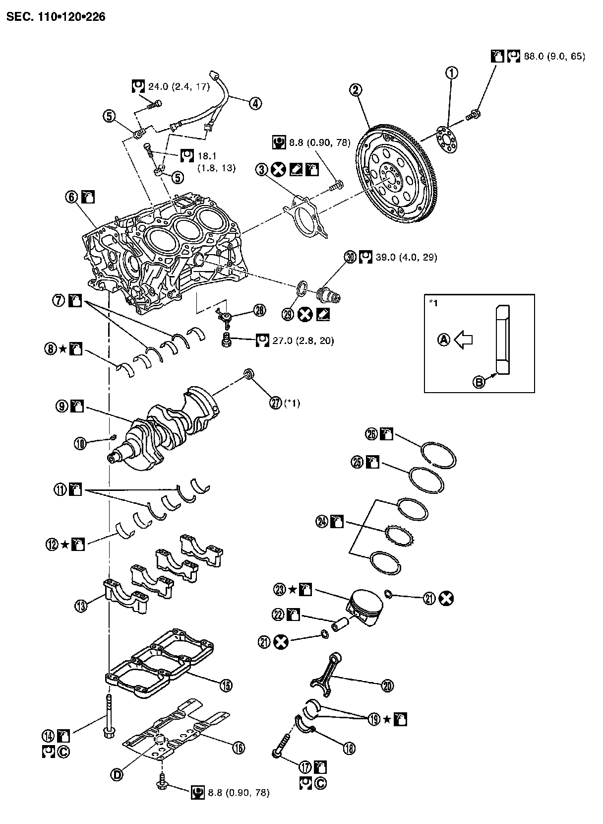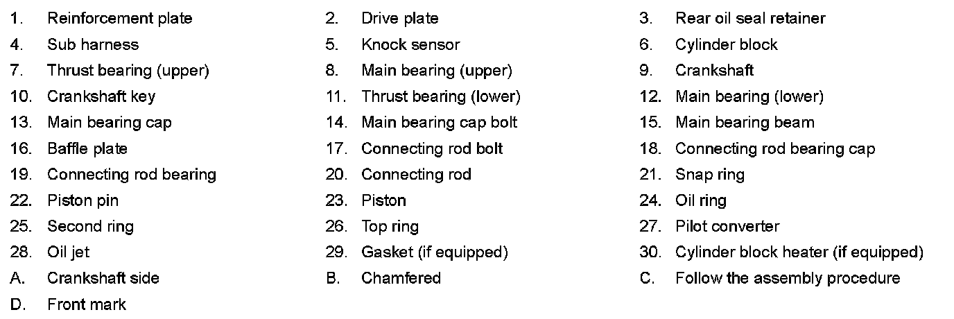 - Assemble so that the piston front mark (B) on the crown and the oil hole (C), connecting rod front mark (D) and Cylinder No.