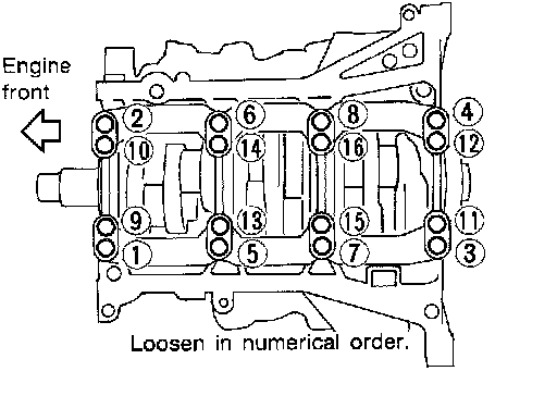 18.Loosen the bolts in the numerical order as shown and remove the main bearing beam, bearing caps and crankshaft.