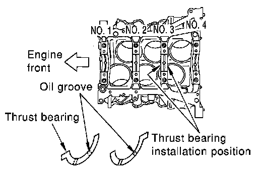 - Install the thrust bearings with the oil groove facing the crankshaft arm (outside).