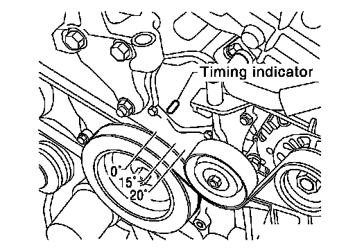 a.Rotate crankshaft pulley clockwise to align timing mark (grooved line without color) with timing indicator.