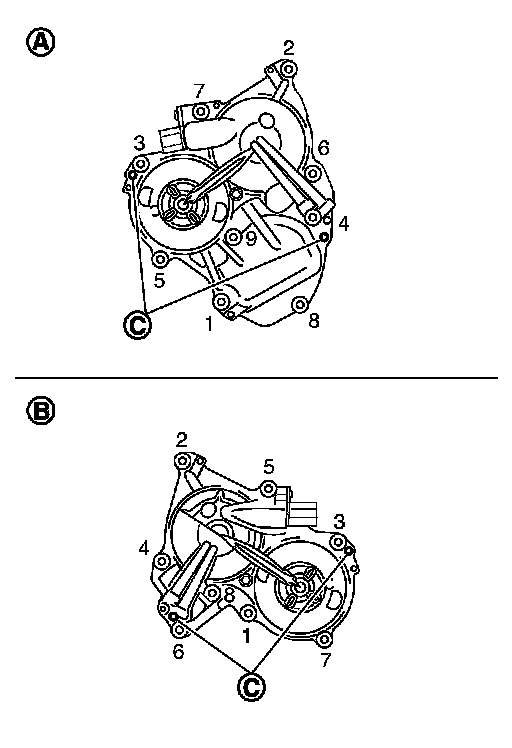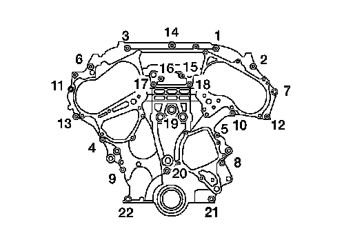 - Retighten the front timing chain case bolts in the order as shown.