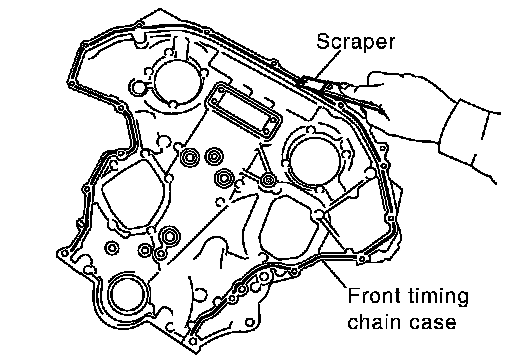 39.Use a scraper to remove all of the old Silicone RTV Sealant from the front timing chain case and opposite mating surfaces.