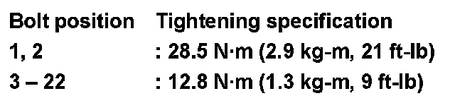 7.Tighten the front timing chain case bolts in the order as shown.