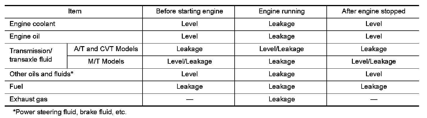 - Warm up engine thoroughly to make sure there is no leakage of fuel, exhaust gas, or any oils/fluids including engine oil and engine coolant.