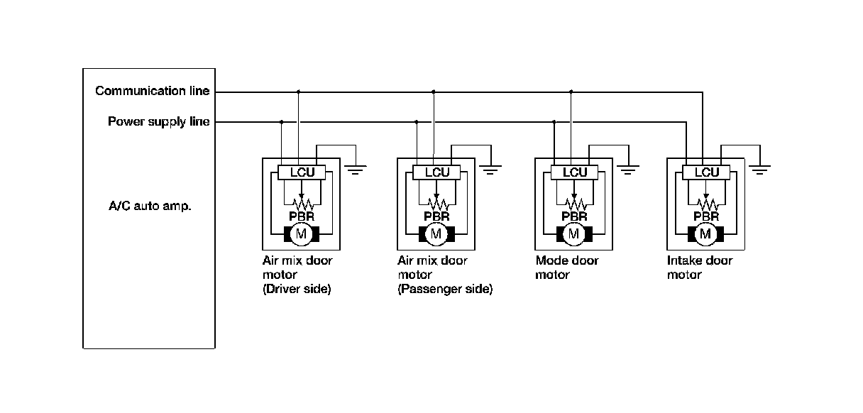 The intake doors are automatically controlled by the temperature setting, ambient temperature, in-vehicle temperature, intake temperature, amount of sunload and ON/OFF operation of the A/C compressor.