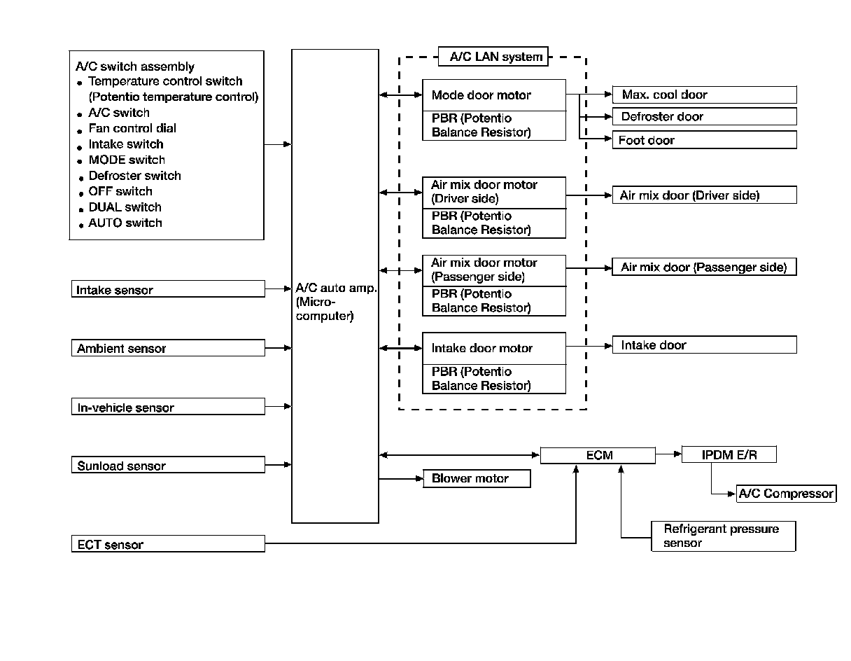 The control system consists of input sensors, switches, the A/C auto amp. (microcomputer) and outputs. The relationship of these components is as shown in the figure below: