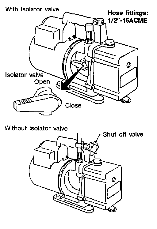 - Usually vacuum pumps have a manual isolator valve as part of the pump. Close this valve to isolate the service hose from the pump.