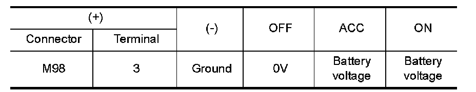 2.Check voltage between the A/C and AV switch assembly connector M98 and ground.