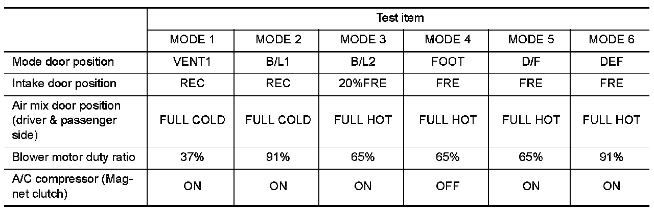2.Refer to the table and check the outlet, inlet, airflow temperature, blower motor control signal, magnet clutch operation, and air mix ratio. Visually check each operating condition, by listening for noise, touching air outlets with a hand, etc.