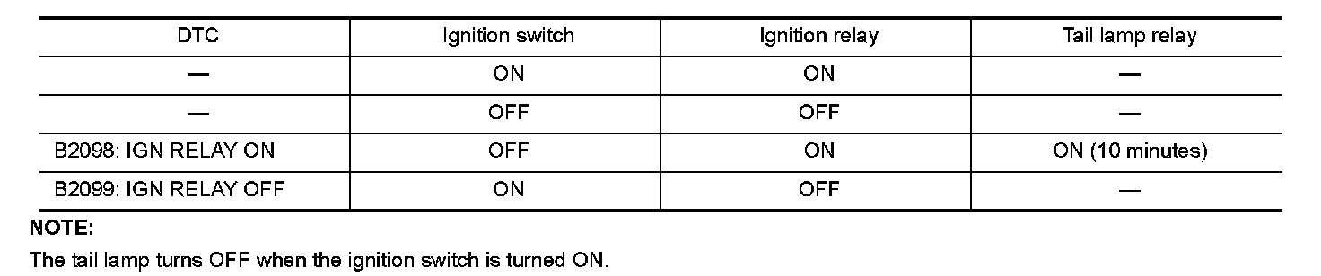 - If the ignition relay cannot turn OFF due to contact seizure, it activates the tail lamp relay for 10 minutes to alert the user to the ignition relay malfunction when the ignition switch is turned OFF.
