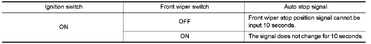 When a front wiper auto stop signal is in the conditions listed below, IPDM E/R stops power supply to wiper after repeating a front wiper 10 second activation and 20 second stop five times.