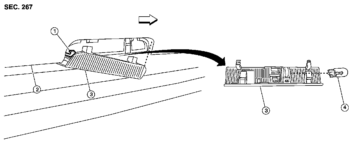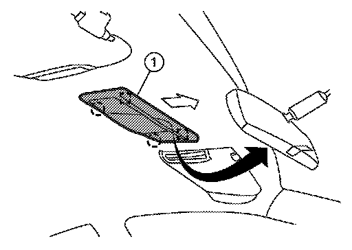 1.Release the metal clips and drop front edge of front room/map lamp assembly (1) away from headlining. Slide front room/map lamp assembly forward in vehicle to clear pawls at rear.
