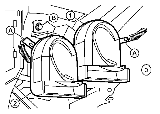 4.Remove the horn bracket bolt (B), and remove horn (1) and horn (2).