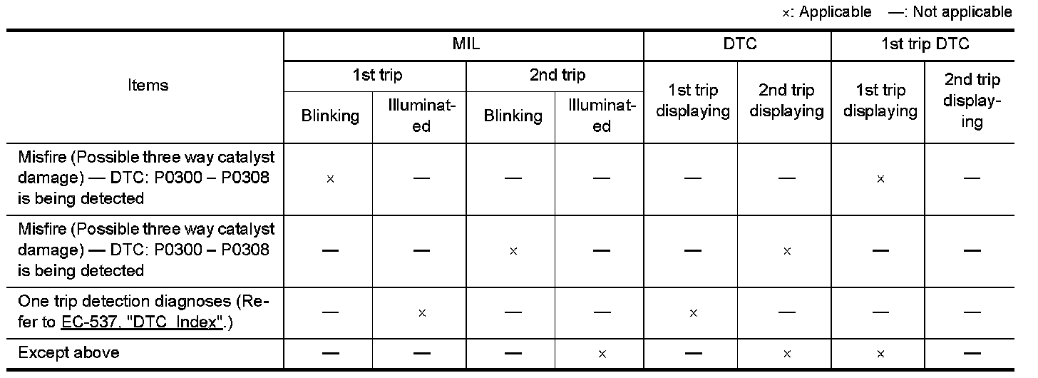 <2nd trip> The "trip" in the "Two Trip Detection Logic" means a driving mode in which self-diagnosis is performed during vehicle operation. Specific on board diagnostic items will cause the ECM to illuminate or blink the MIL, and store DTC and Freeze Frame data, even in the 1st trip, as shown below.