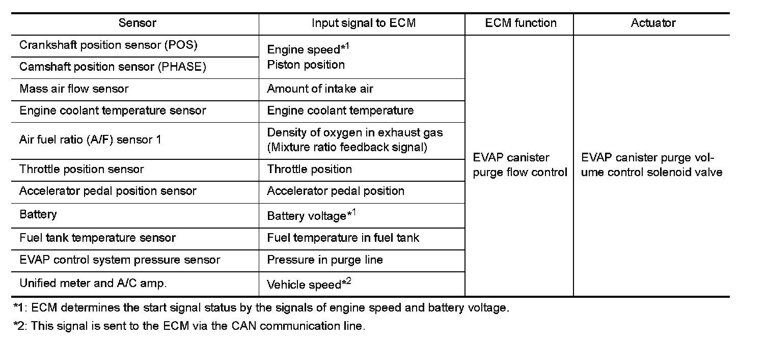 The vapor in the EVAP canister is purged by the air via the purge line to the intake manifold when the engine is operating. EVAP canister purge volume control solenoid valve is controlled by ECM. When the engine operates, the flow rate of vapor controlled by EVAP canister purge volume control solenoid valve is proportionally regulated as the air flow increases.