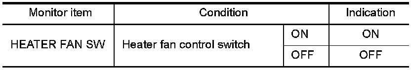 Select "HEATER FAN SW" and check indication under the following conditions.