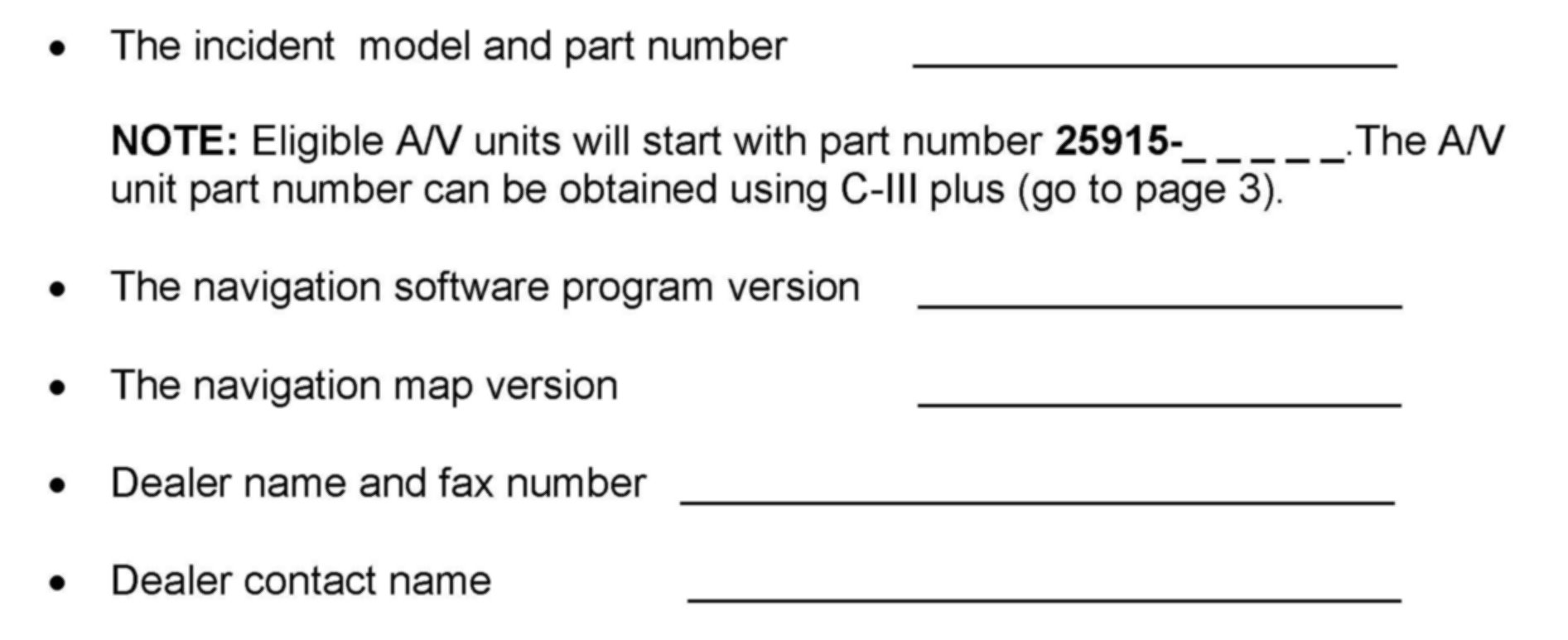 g. Before an order is placed, the technician/dealer will need to provide TECH LINE with the following information from the incident unit: