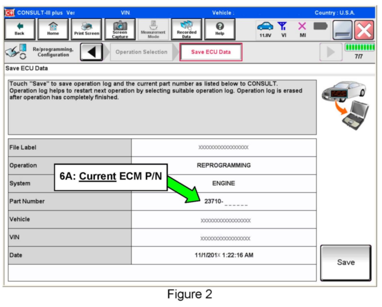 1. Connect the CONSULT PC to the vehicle to begin the reprogramming procedure.