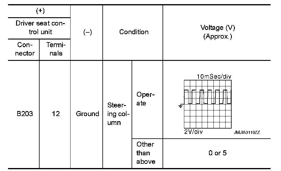 2.Check voltage signal between driver seat control unit connector and ground with oscilloscope.