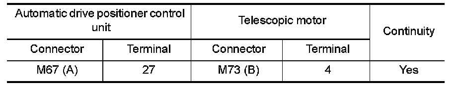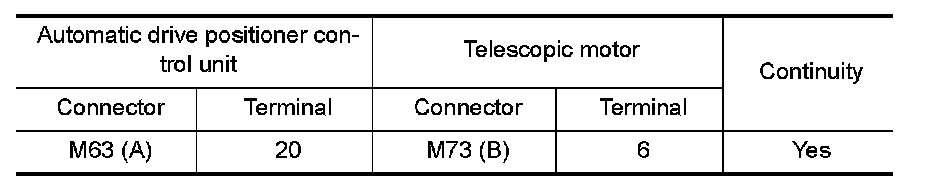 3.Check continuity between automatic drive positioner control unit harness connector and telescopic motor harness connector.