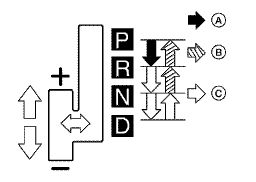 - (A): Press shift selector handle button to operate CVT shift selector, while depressing the brake pedal.