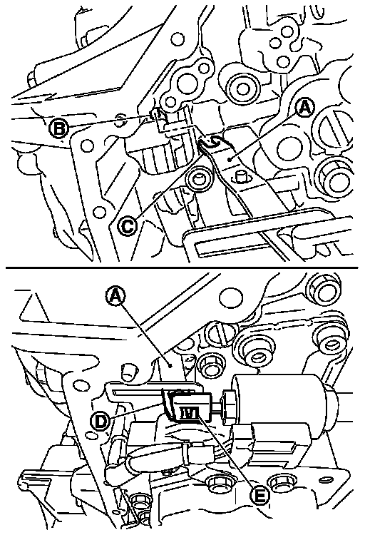 engages with the pin (B) of pulley sensor. Check that the notch (D) at the other end of shift link (A) engages with step motor and that the bracket of shift link (A) engages with the hole (E) of step motor.