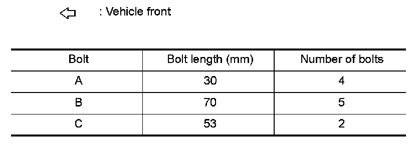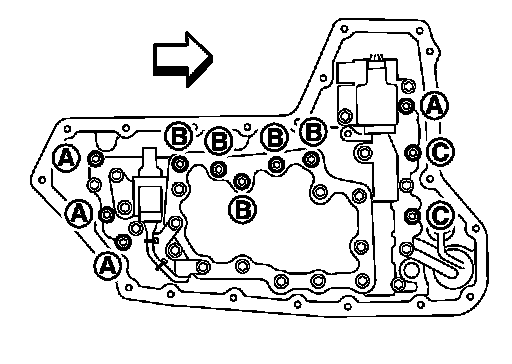 9.Remove the control valve bolts (A), (B) and (C), and then remove the control valve from the transaxle case.