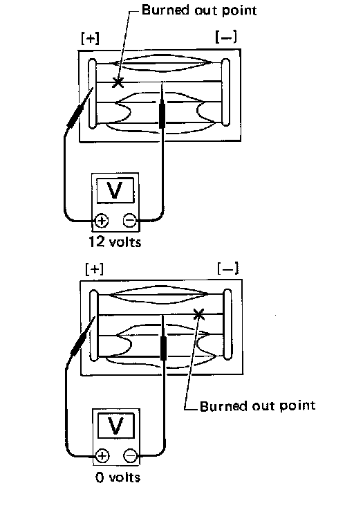 4.To locate burned out point, move probe to left and right along filament. Test needle will swing abruptly when probe passes the point.
